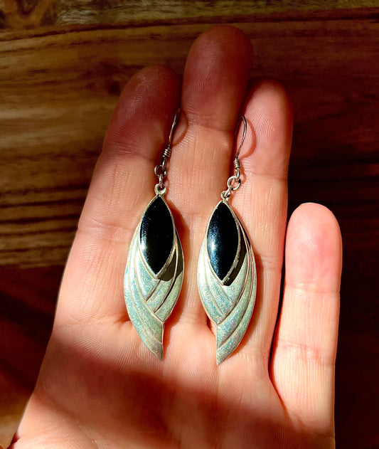 Sterling Silver 925 Black Onyx Feather Style Dangly Earrings