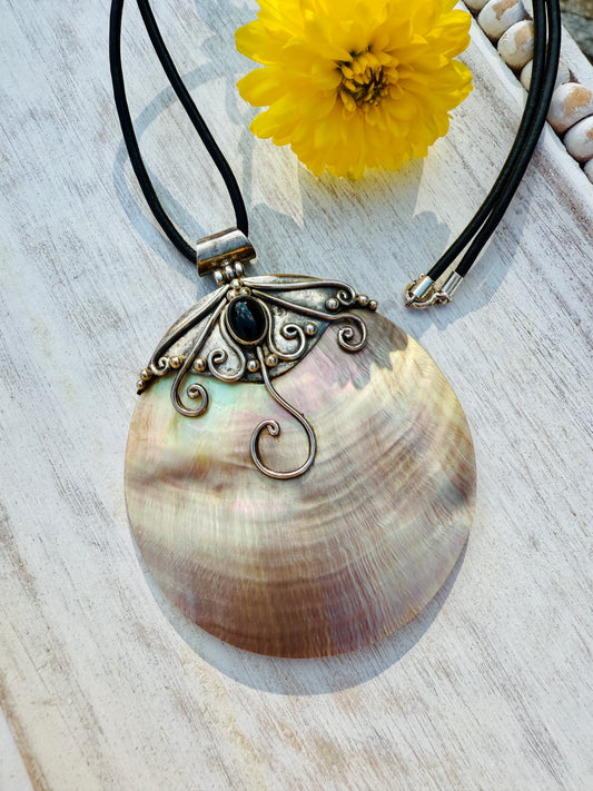 Sterling Silver Abalone Shell & Onyx Necklace – Leather Cord Statement Pendant