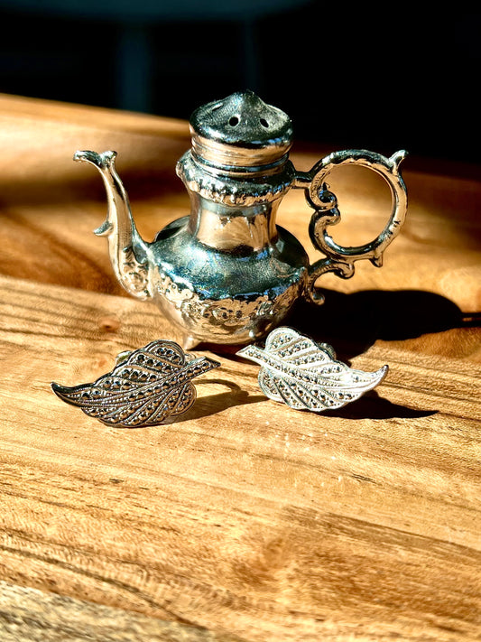 Sterling Silver 925 Marcasite Vintage Leaf Screw Back Earrings
