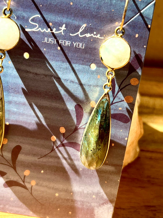 Shimmer & Shine Labradorite and Moonstone Dangle Drop Earrings, Blue Green Shimmer, Gold Plated Metal