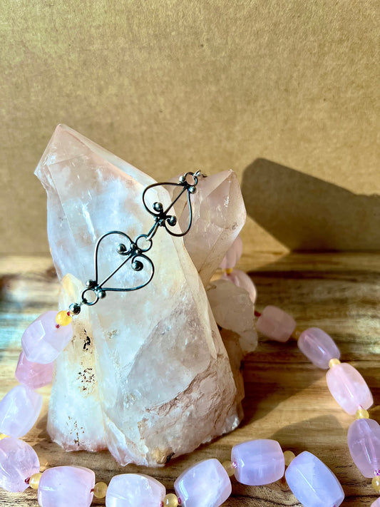 Rose Quartz Citrine Beaded Hand Knotted Statement Gemstone Choker Necklace W/ Fancy Sterling Clasp