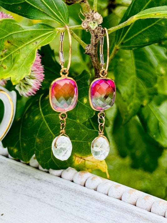 Pink Ombré Quartz Glass and Blue Topaz Gemstone Dangle Drop Earrings, Popping Colors, Gold Plated Metal