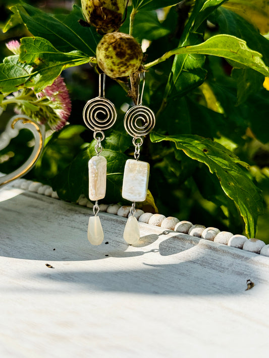 Handcrafted Sterling Silver Pearl and Moonstone Earrings – Spiral Drop Design