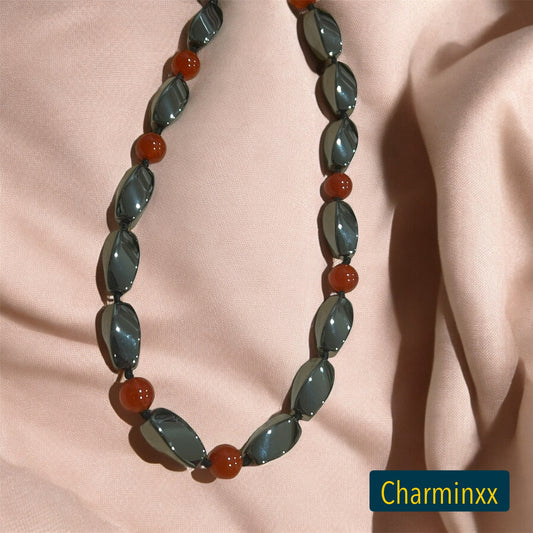 Sterling Hand Knotted Carnelian Hematite Long Necklace