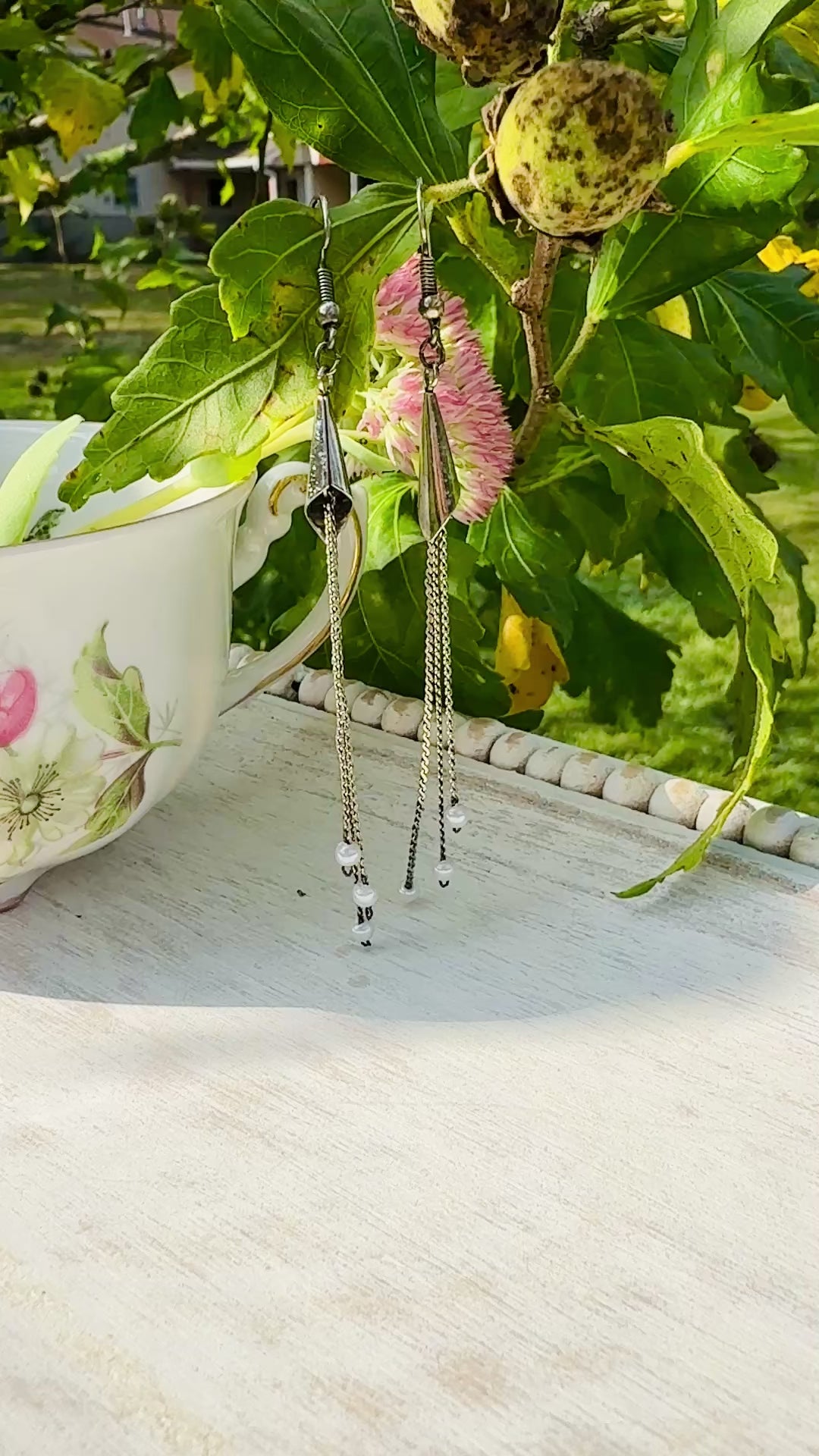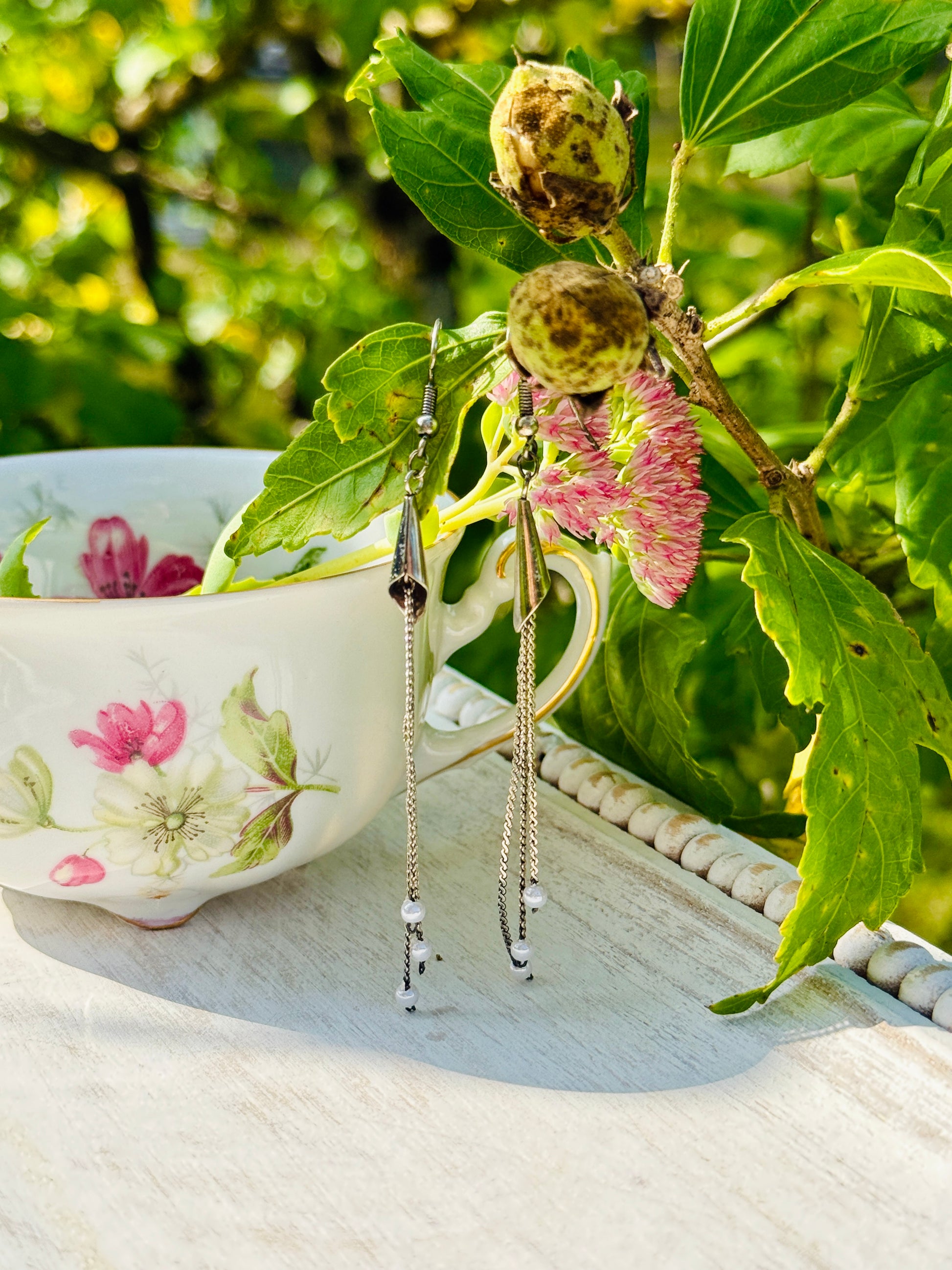 These sterling silver tassel earrings bring a modern yet graceful touch to any look. Designed with fine chain drops that sway gently with movement, they capture the perfect mix of minimalism and sophistication. Each strand ends in a tiny faux pearl bead, adding soft shimmer and fluid elegance.